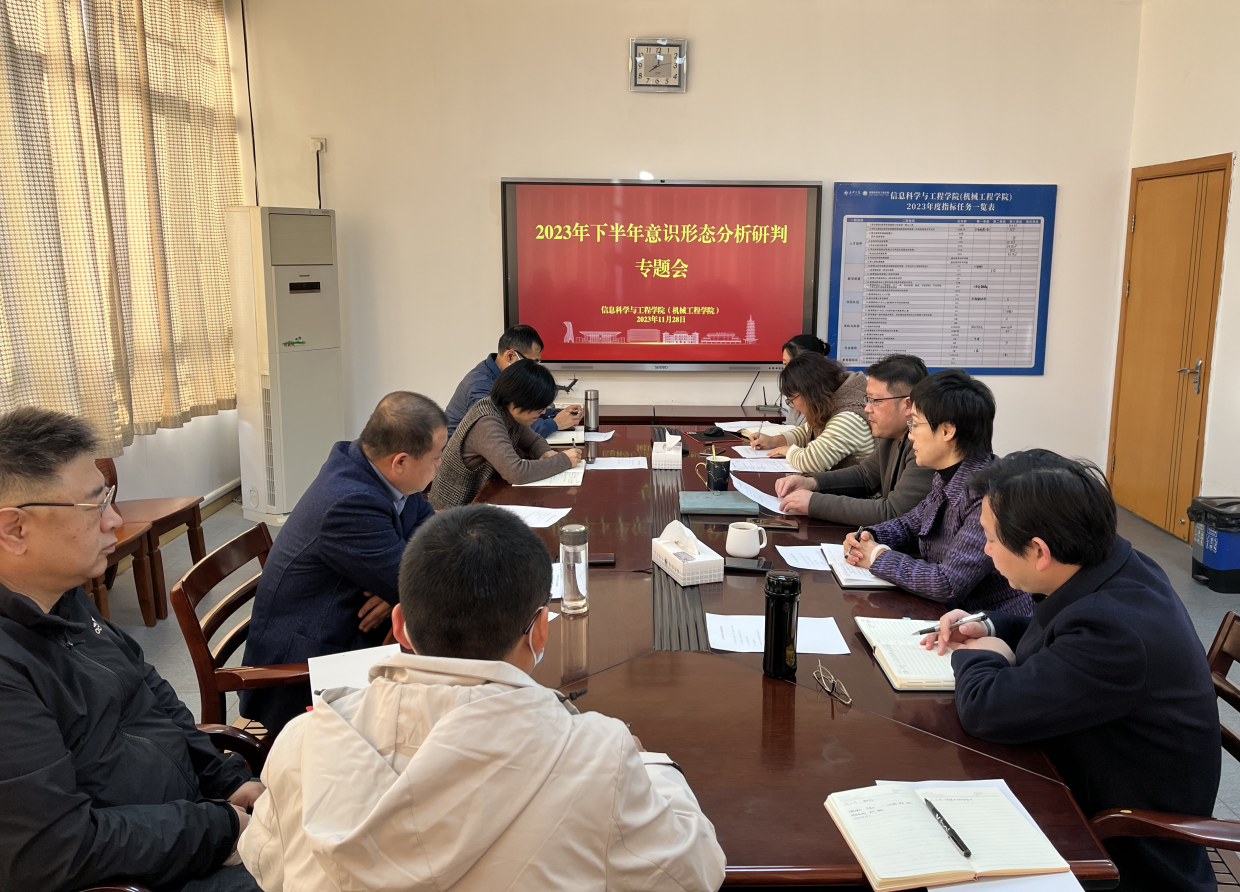 (机械工程学院)党委在兴礼楼303会议室召开2023年度下半年意识形态分析研判专题会议。学院党政领导班子成员、党委委员、三办主任和学院教学督导组组长参加会议。会议由院党委书记谢宏主持。